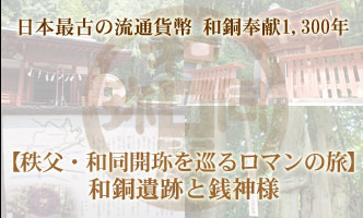 元明天皇の慶雲五年(七0八年)、我が国初のニギアカガネ(自然銅)が秩父の地で見つかり、朝廷に献上されました。 それがきっかけとなり、我が国最初の流通貨幣【和同開珎】が鋳造されました。 朝廷は、勅使を遣わし祝山(イワイヤマ)に神籬(神霊の宿るところ)を建てて金山彦尊を祀り祝典を挙げました。